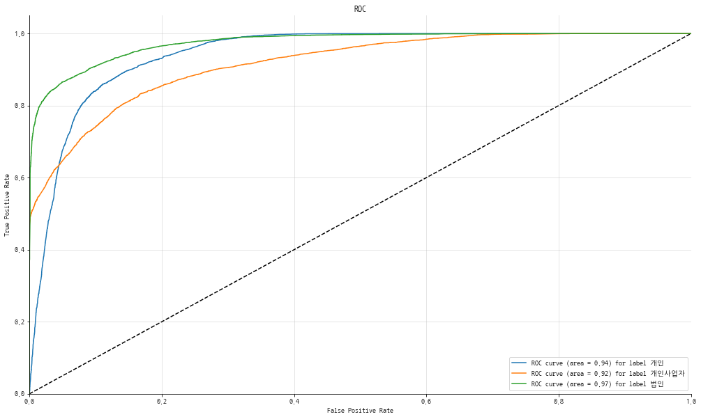 ROC Curve는 개인/개인사업자/법인의 예측 확률을 Threshold로 사용하기 때문에 원핫 벡터 형태의 데이터를 넣으면 그림처럼 각이 생기게 됩니다.