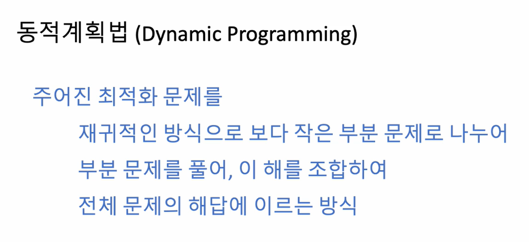 주어진 최적화 문제를 재귀적인 방식으로 보다 작은 부분 문제로 나누고, 부분 문제를 풀어서 전체 문제의 해답에 이르는 방식이다.