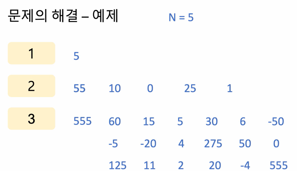 N = 5 일 때, 경우의 수를 +-x/모두 계산하여 이를 집합으로 구성하여 가짓 수를 만들어서