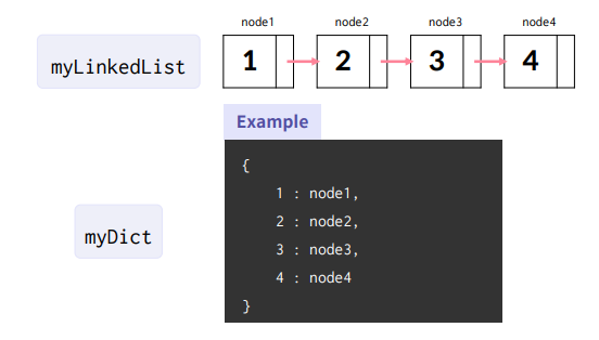 이 단점을 개선하기 위해 연결 리스트 내에 딕셔너리를 두고, 모든 노드들의 정보를 저장하고 있도록 한다.