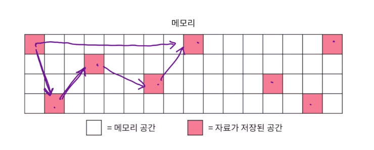 연결리스트는 포인터의 형태로 임의로 엮어준것에 불과함 배열에서 순회를 할때 이웃한 인자를 스캔하는게 아닌,