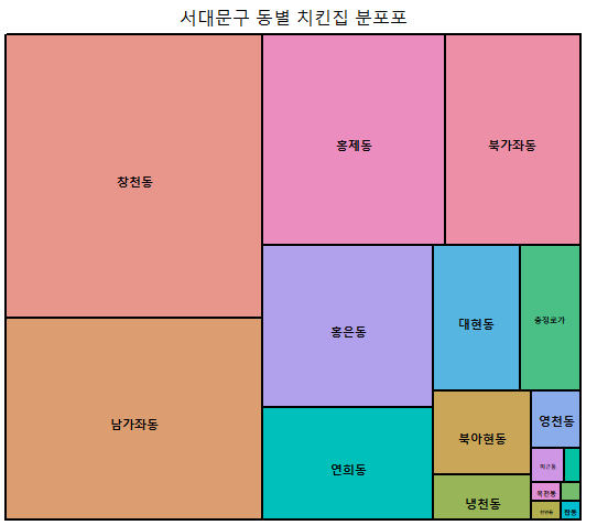 '서울시의 특정구를 선정하여 해당 구안에서 동별 치킨집 분포를 트리맵을 이용하여 시각화'