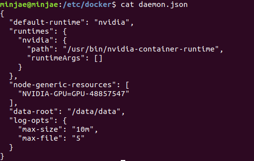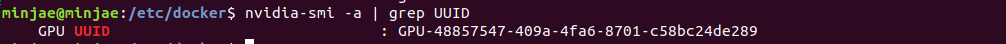 이 gpu uuid를 docker의 deamon.json에 작성해준다.