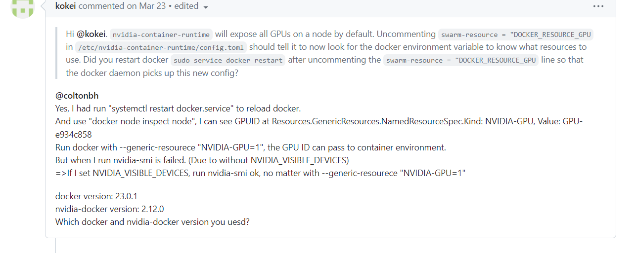 NVIDIA_VISIBLE_DEVICES를 설정하면 --generic-resourcee "NVIDIA-GPU=1"과 상관없이 gpu를 할당할 수 있다고 한다.