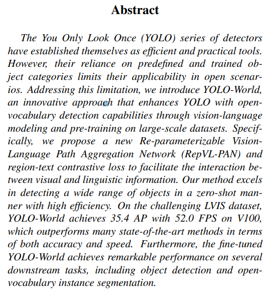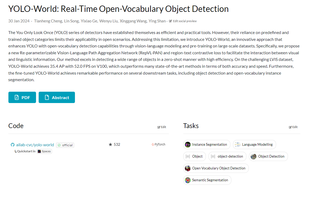 SOTA에 방문해서 최신모델들이 어떤것들이 있나 찾아보다가 2024년 1월 31일에 발표된 Yolo-World 모델을 보게 되었다.