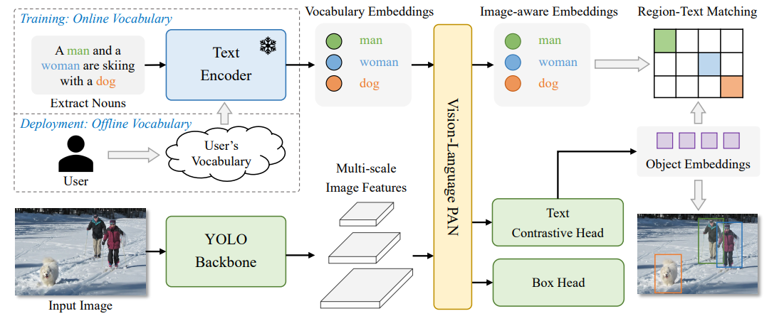 전통적인 YOLO 탐지기와 비교하여, 오픈 어휘 탐지기인 YOLO-World는 텍스트를 입력으로 사용하고, 텍스트 인코더는 먼저 입력 텍스트를 임베딩으로 인코딩을 한다. 그런 다음 이미지 인코더는 입력 이미지를 다층 이미지 특징으로 인코딩하고, RepVL-PAN은 이미지와 텍스트 특징 모두에 대해 다층 교차 모달 융합을 활용한다. 마지막으로, YOLO-World는 입력 텍스트에 나타난 카테고리 또는 명사와 일치하는 보정된 바운딩 박스와 객체 임베딩을 예측을 실시한다.