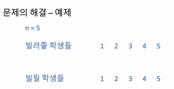 - 빌려 줄 수 있는 다른학생은 해시를 적용해서 상수 시간에 처리하면 된다.