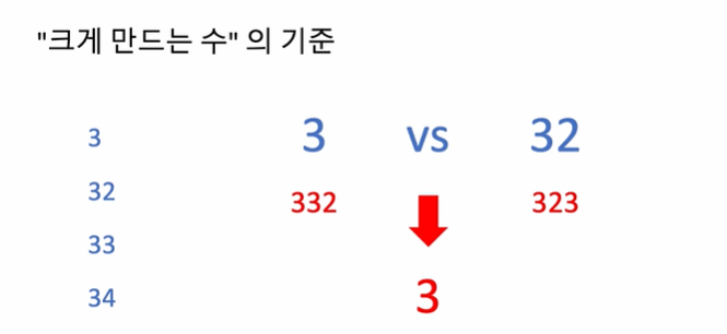 - 크게 만드는 기준을 볼때, 3과 32가 있으면 332가 323보다 크므로 3이 먼저 와야된다.