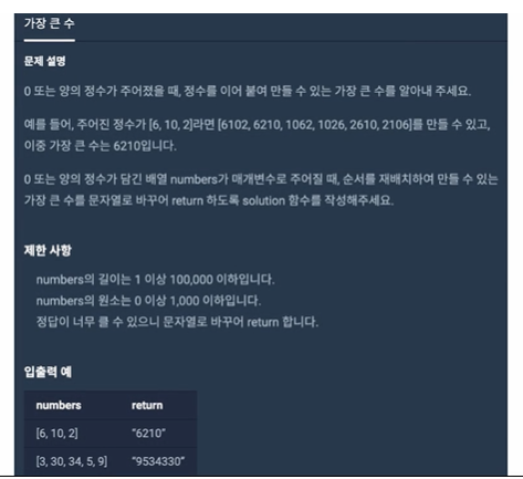 - [6,10,2]가있으면 이를 조합하여 장 큰 수를 문자열로 출력해야 함