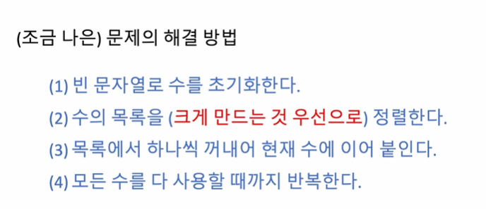 1) 빈 문자열로 수를 초기화 -> 가장 크게 만들 수 있는 수를 고름 -> 그 수를 현재 수에 이어 붙임 -> 모든 수를 다 사용할때까지 반복함