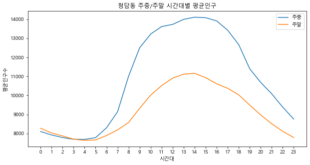# 4.1 입력된 행정동의 주중/주말 시간대별 평균인구 구하기